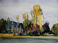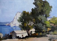Mihovil Krušlin: Sunčani dan, oko 1935., akvarel, 31x42 cm (vlasnik Muzej Brdovec)